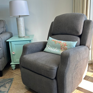 We worked hard our last 2 visits to bring new improvements to the Florida Girl condo for the 2024 season. The most obvious update is new living room furniture! A love seat facing towards the best view you'll ever have, a full sleeper sofa, and a rocker/recliner/swivel chair. Along with the living room updates, we also repainted the end tables to a bright teal color, and the coffee table to a new bright blue. Expanding the Florida Girl artwork, 3 new paintings by Florida Girl now hang above the living room couch, adding even more style and bright colors to this ocean view condo.